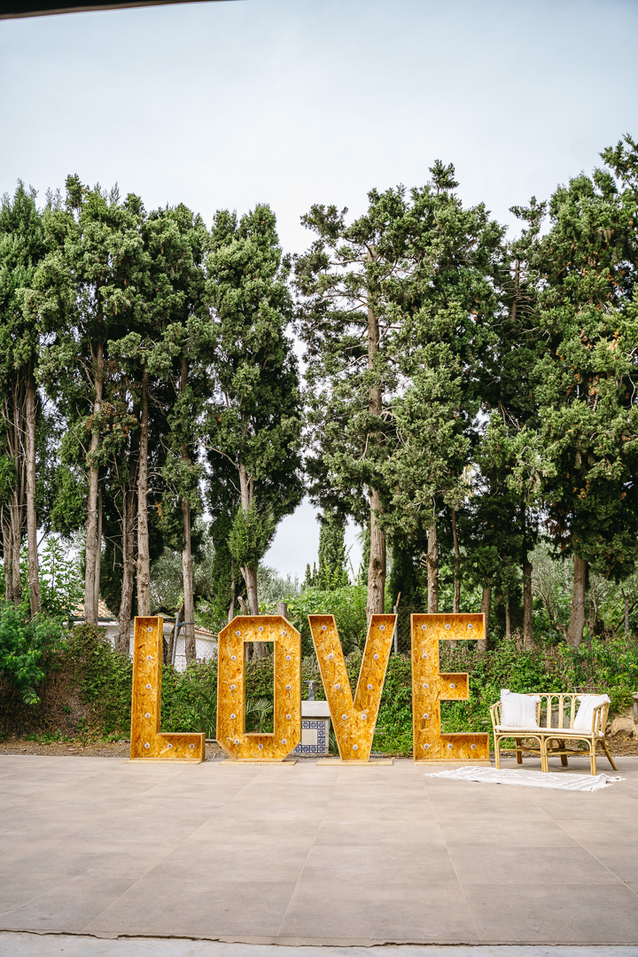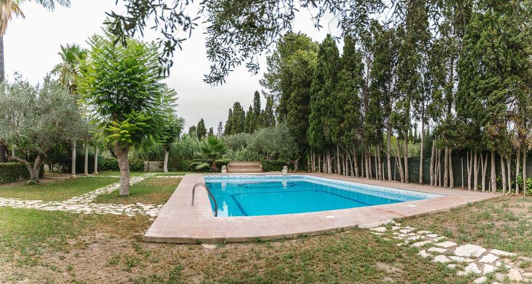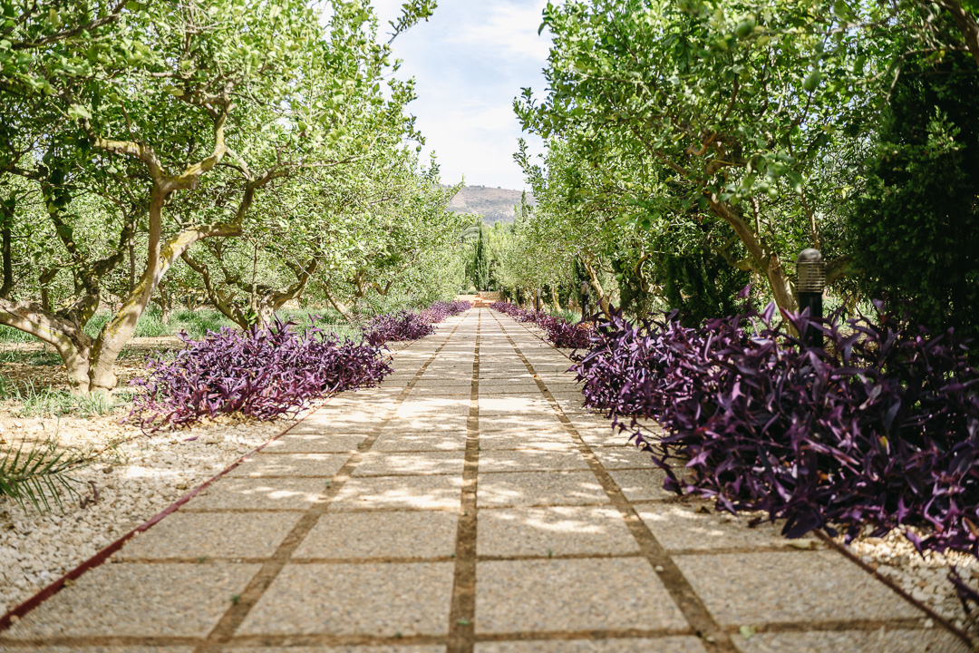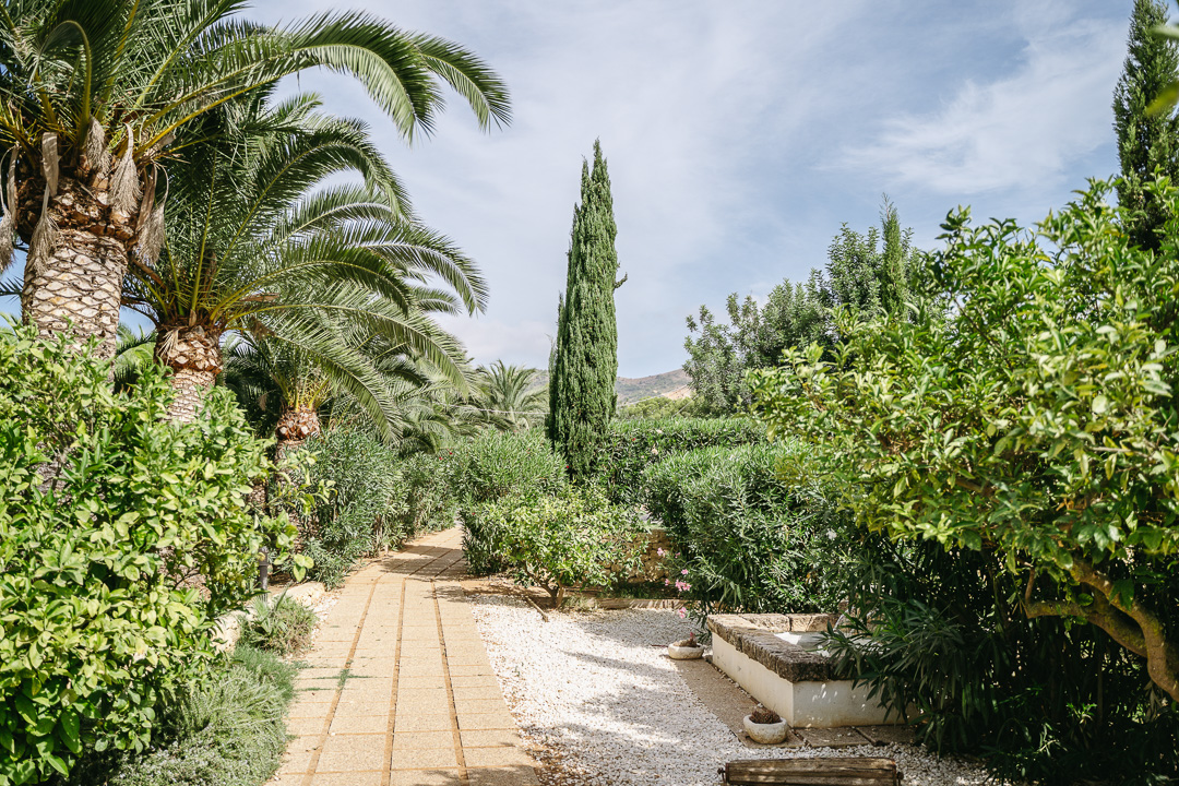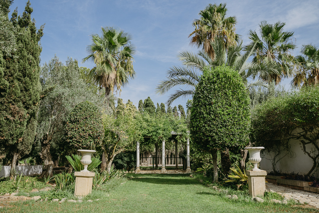 Alrededor de la casa principal, amplias terrazas protegidas del sol por pinadas crean el lugar perfecto para ceremonias y cócteles al aire libre, con capacidad para hasta 150 personas. La entrada principal, flanqueada por cipreses, da paso a una avenida de esbeltas palmeras, culminando en la majestuosa casa principal.