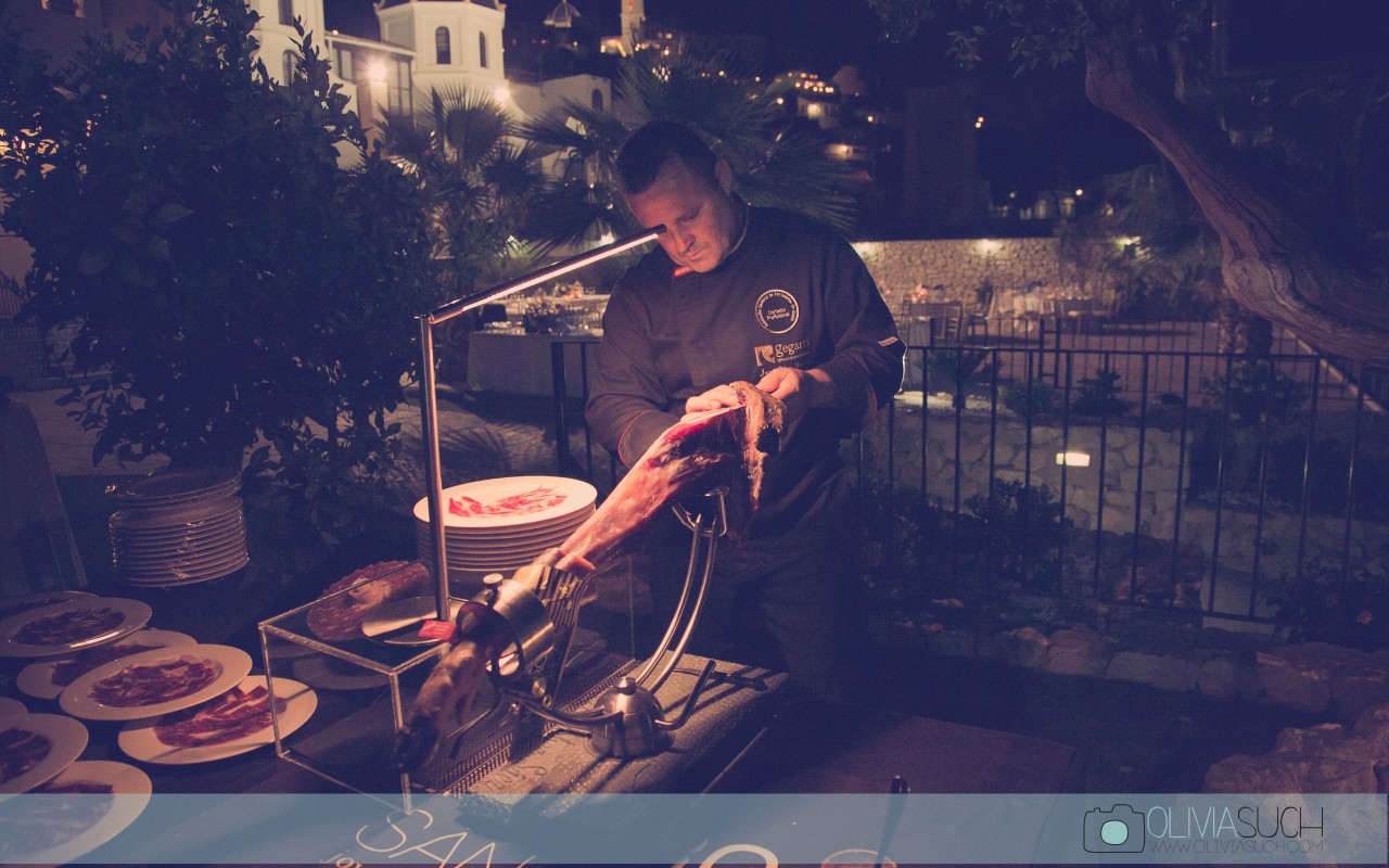 After a varied cocktail with spanish ham and cheese spaces included as well as a show cooking, the dinner was served in the area facing the pool.