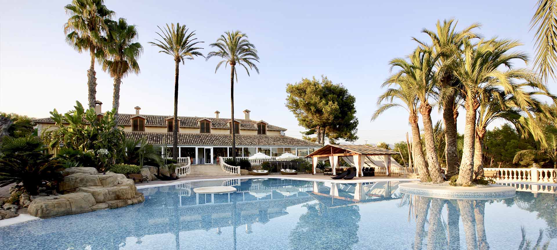 Benidorm has its own rhythm, but as soon as you cross the entrance to Finca Les Palmeres, everything becomes calm. Just a stone’s throw from the centre (approx. 5 minutes) and with the AP-7 just 1 minute away, access is incredibly easy for guests and suppliers. The setting is 100% Costa Blanca: palm trees, natural lawn, all immaculate, and a large lagoon-style pool that defines the character of the space.