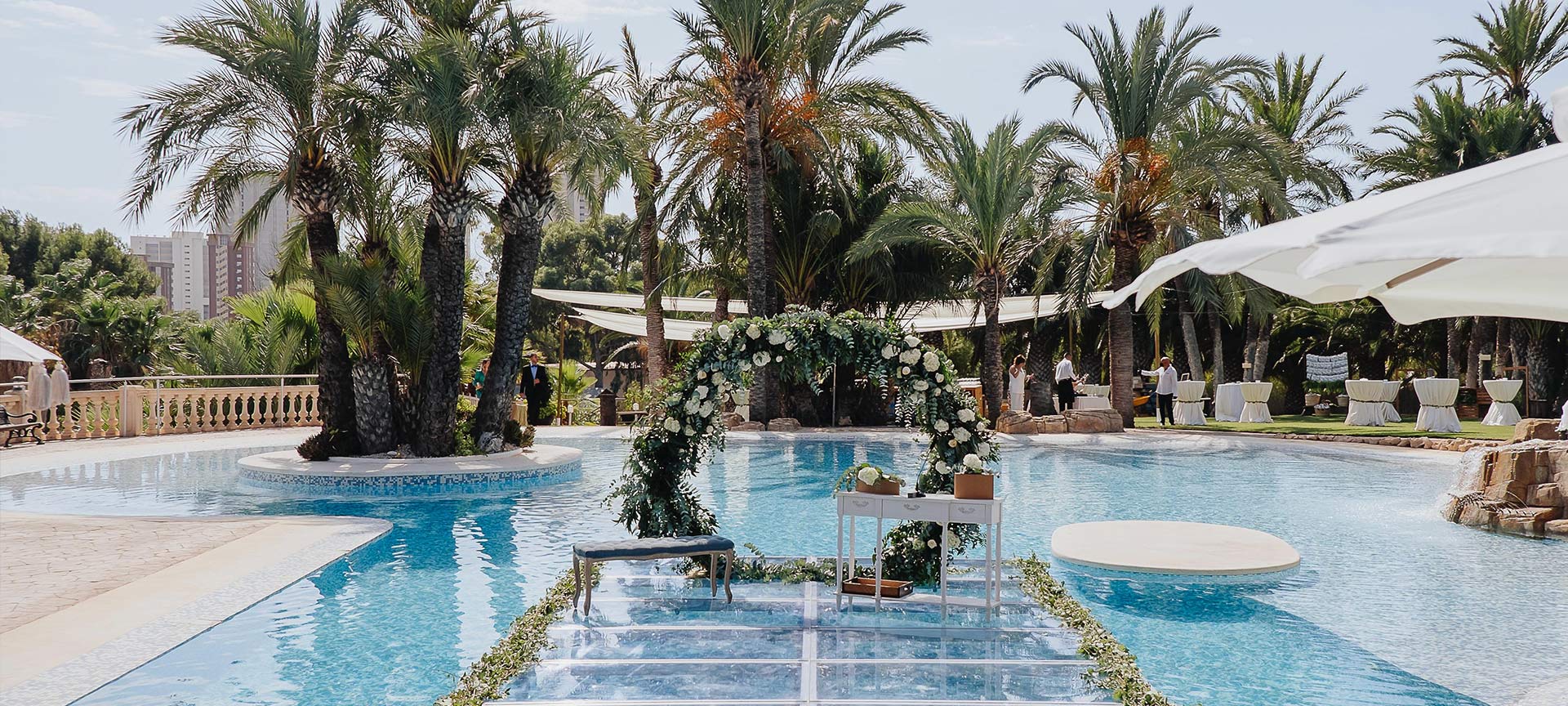 If you’re looking for a wedding venue in Benidorm with a pool, gardens and an elegant plan B, I’d like to invite you to come and see it. We’ll show you the three ceremony settings, test different set-ups and go through the menus.