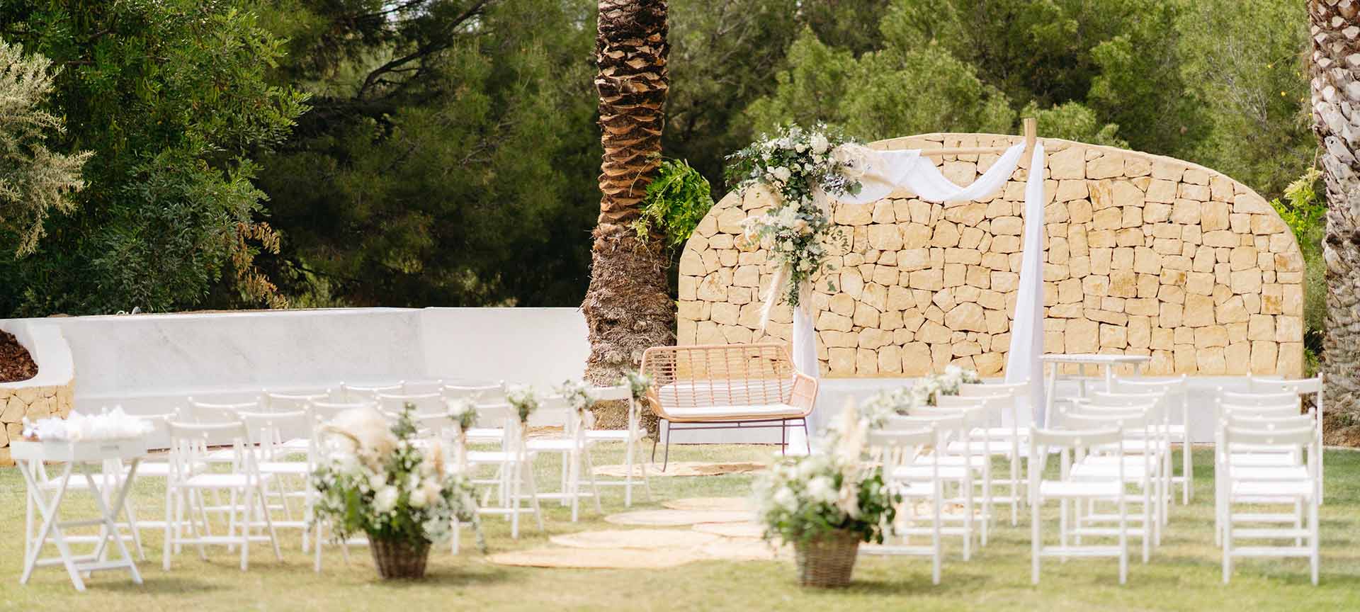 We’ve been organising weddings here for years and we know how to make the most of every season. On spring and autumn days, we usually start with a sunset cocktail among the palm trees; in the height of summer, later timings work brilliantly to avoid the heat and make the most of the evening lighting. And there’s something important that sets us apart: only one event is held per day. The finca is yours, with no rush and no overlaps.