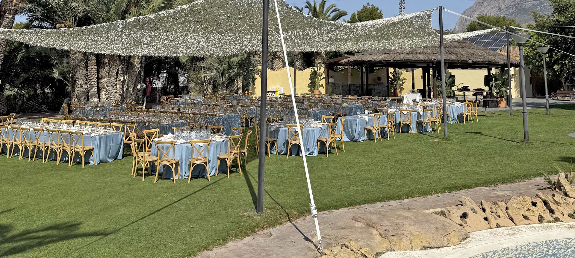 If you’re looking for an intimate vibe, the area with olive trees and palms offers natural shade and a green backdrop that’s perfect for floral arches, structures or minimalist décor. And when you prefer a very Benidorm look – blue, light and summer – we hold the ceremony with the pool as a backdrop and a light set-up that lets the landscape breathe.